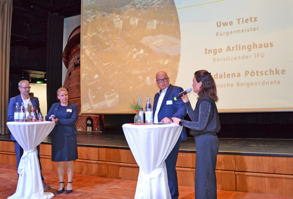Begrüßt wurden die geladenen Gäste aus Wirtschaft, Verwaltung und Politik vom IFU-Vorsitzenden Ingo Arlinghaus, der kurz vor dem Empfang im Amt bestätigt worden war, und erstmals von Uwe Tietz. Der neue Bürgermeister und die ebenfalls neue Technische Beigeordnete der Stadt Frechen, Magdalena Pötschke, stellten sich bei der anschließenden Podiumsdiskussion, gemeinsam mit Ingo Arlinghaus, den Fragen von Moderatorin Katie Ulrich. Diese nutzte die Chance, dem Publikum ihre neuen „Local Heroes“ mal etwas genauer vorzustellen.