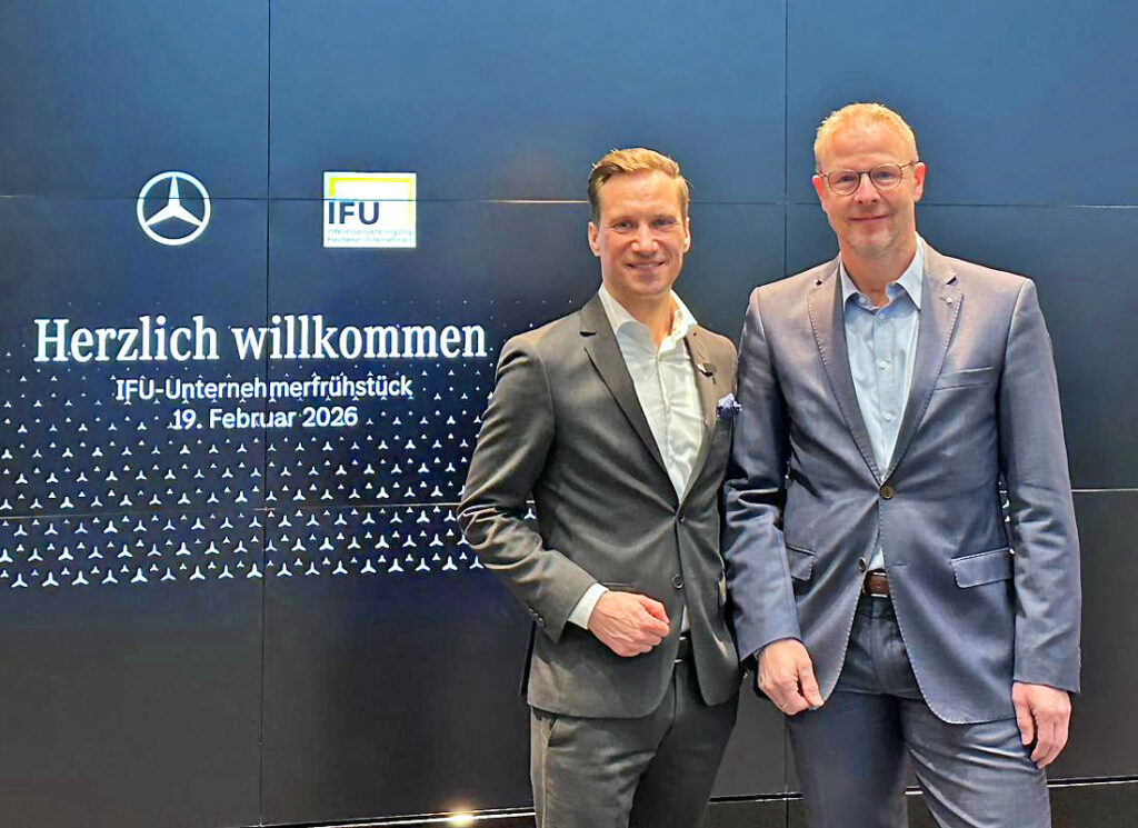 Unter dem Motto „Unser Wirtschaftsstandort lebt vom Dialog und kurzen Wegen“ möchte die IFU interessierte Unternehmer aus Frechen dreimal im Jahr bei einem gemütlichen Frühstück zusammenbringen. Zur Premiere des neuen Formats trafen sich die Teilnehmer im neuen Pkw-Center. Auf 1.800 Quadratmetern bietet das „Autohaus der Zukunft“ 24 Ausstellungsplätze, Büros und Beratungsbereiche sowie das erste Manufakturstudio von Mercedes-Benz in Deutschland, in dem Kunden ihr Auto-Unikat konfigurieren können.